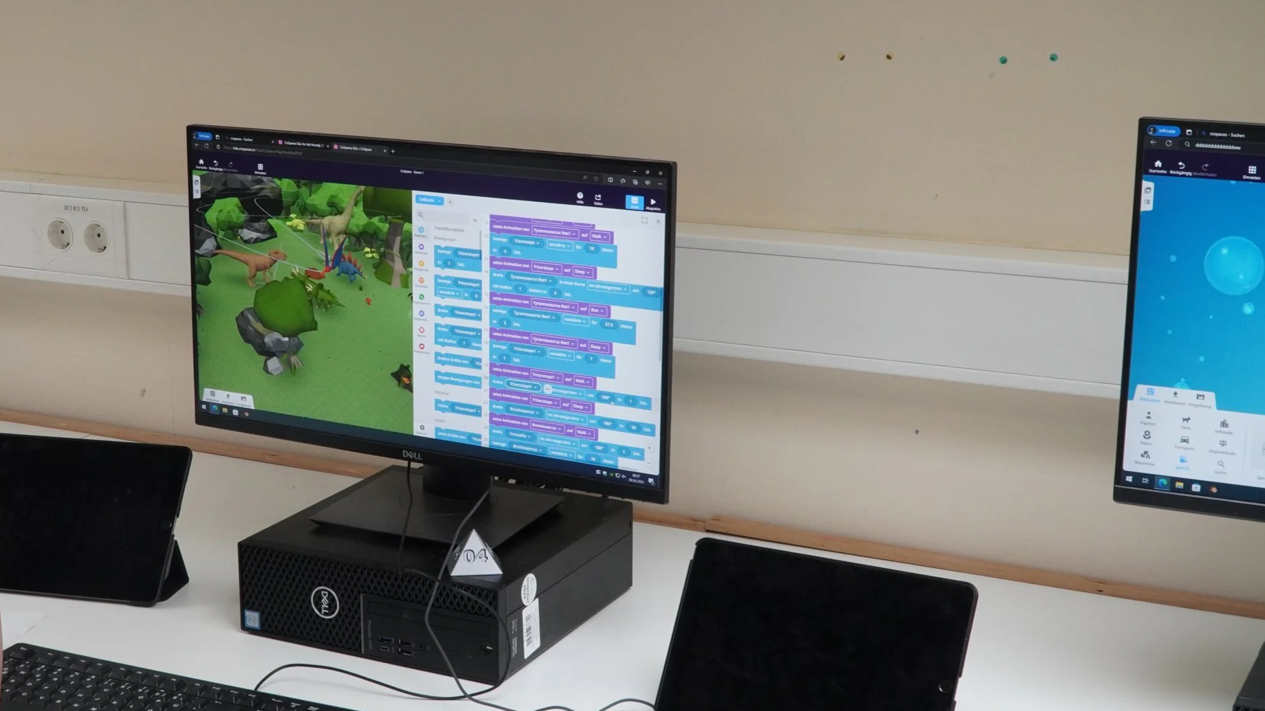 Ergänzend dazu gestalten die Teilnehmer:innen in CoSpaces eigene virtuelle Welten, von Städten über Gebäude und erwecken diese durch Programmierung zum Leben.
